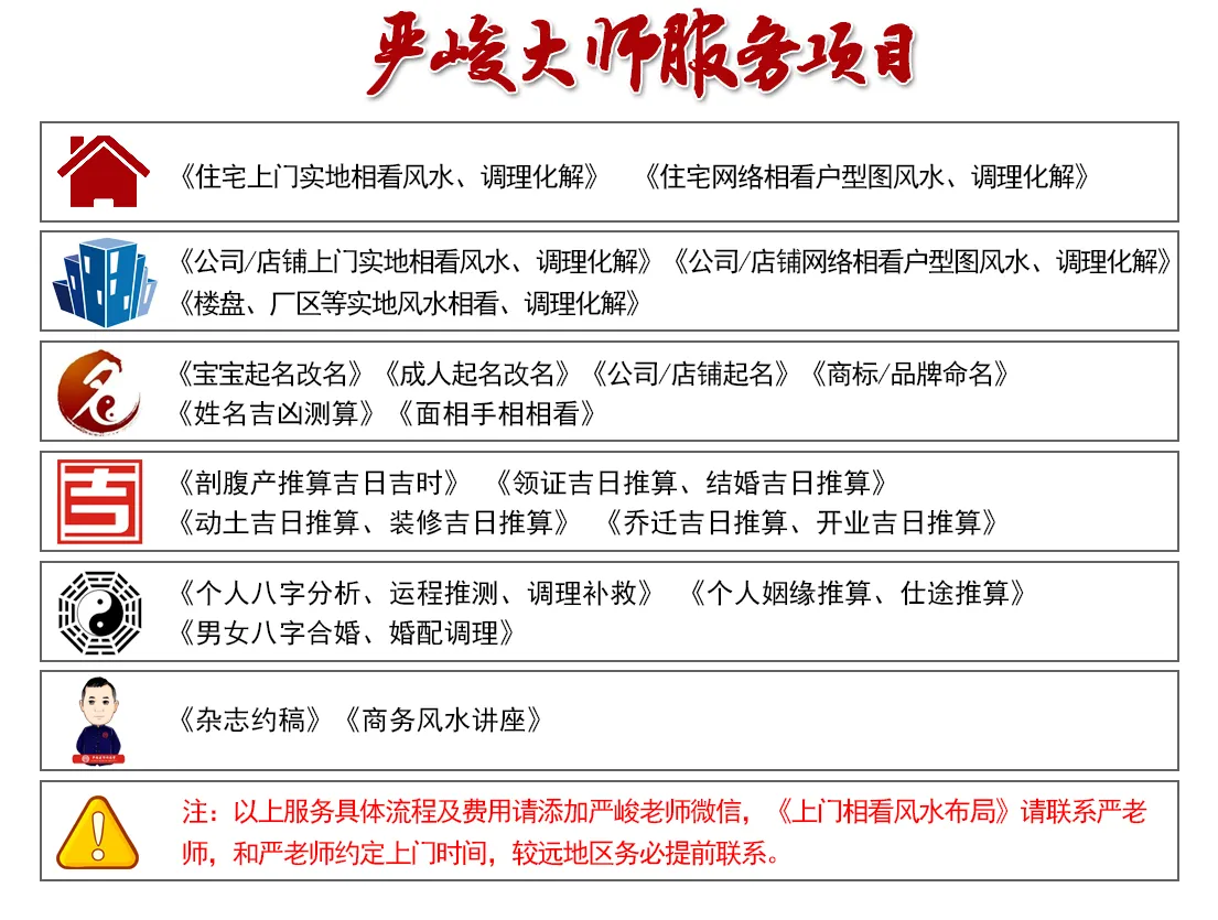 《公司/店铺上门实地相看风水》服务费用,请添加严峻大师个人微信:13759991335,严老师会把服务价格发送给您。
